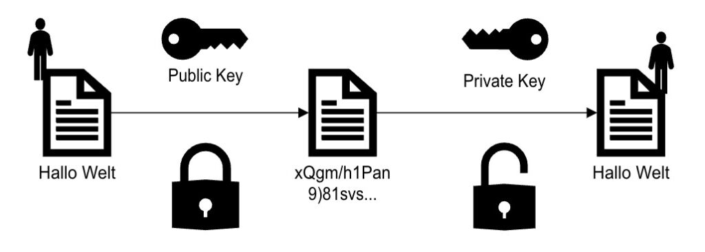 - Beispiel: Der Sender verschlüsselt eine Nachricht mit dem öffentlichen Schlüssel des Empfängers, und nur der Empfänger kann die Nachricht mit seinem privaten Schlüssel entschlüsseln.
